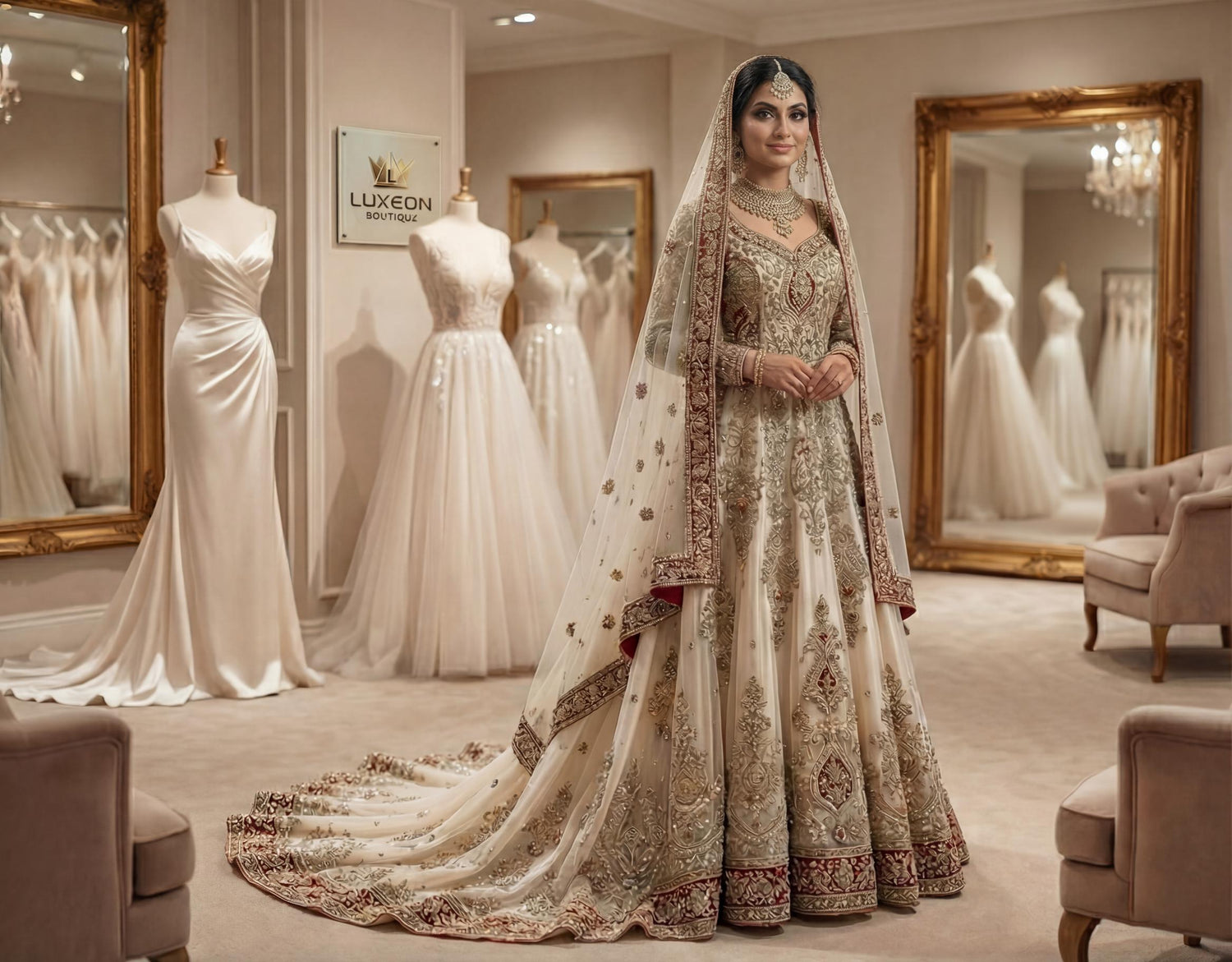 Embrace your royal moment with Luxeon Boutique’s bridal collection, featuring handcrafted lehengas and ghararas adorned with intricate zardozi and dabka work.