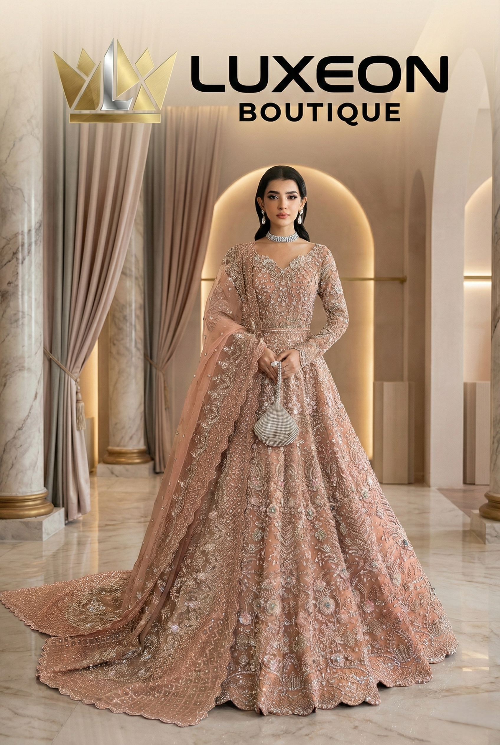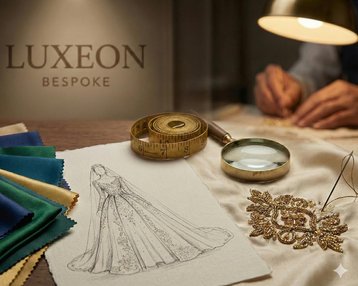 Bring your dream ensemble to life with Luxeon Boutique’s Bespoke service. From selecting the finest fabrics to personalizing every stitch of hand-embroidered detail, our master artisans work directly with you to create a one-of-a-kind masterpiece. Whether it’s a unique bridal vision or a custom formal look, contact us today to begin your journey of personalized luxury tailored exclusively for you.